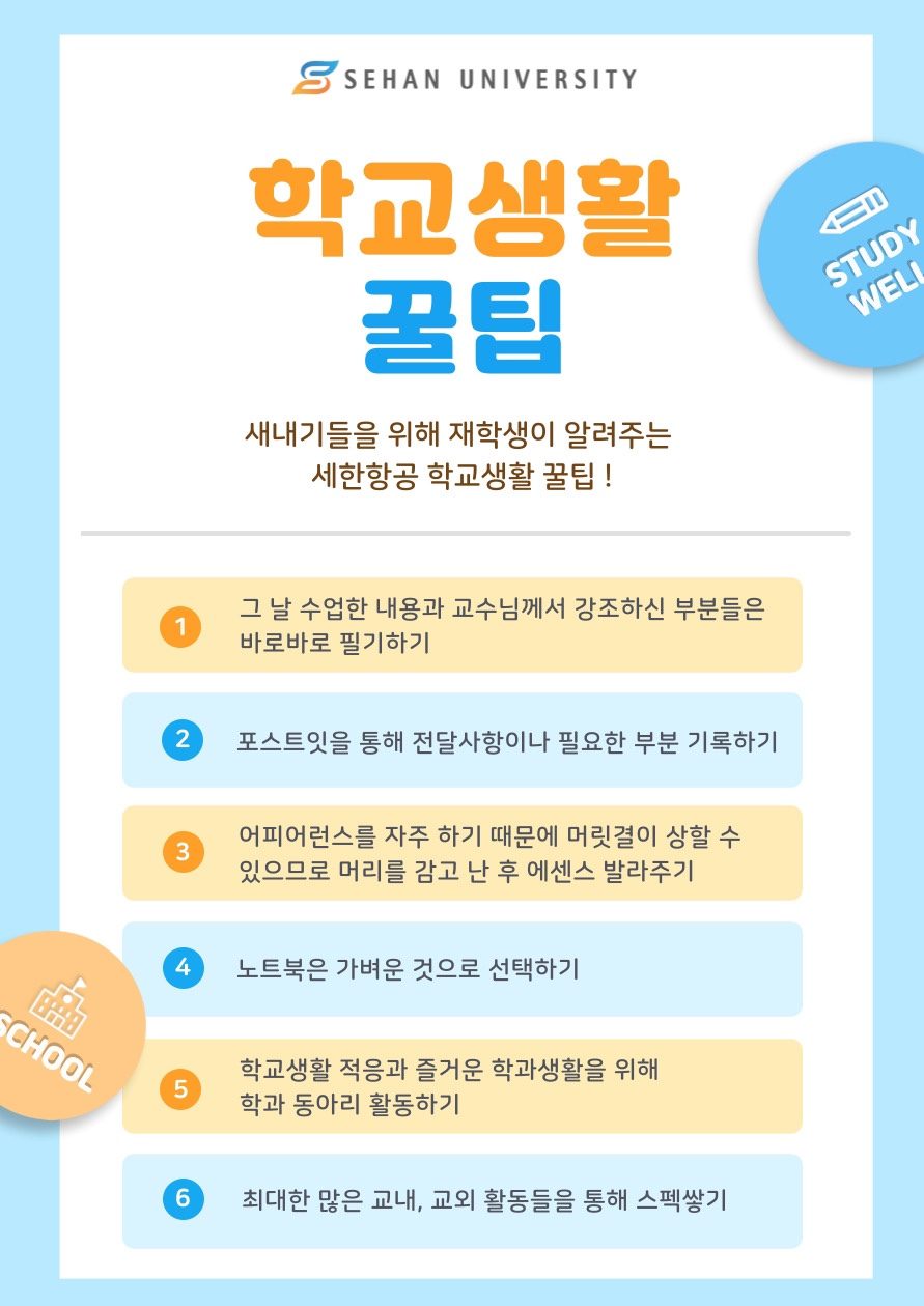 재학생들이 세한대학교 항공서비스학과를 다니면서 자연스레 얻게 된 학교생활 꿀팁들을 통해 22학번 신입생 여러분들의 학교생활에 조금이나마 도움이 될 수 있기를 바랍니다.